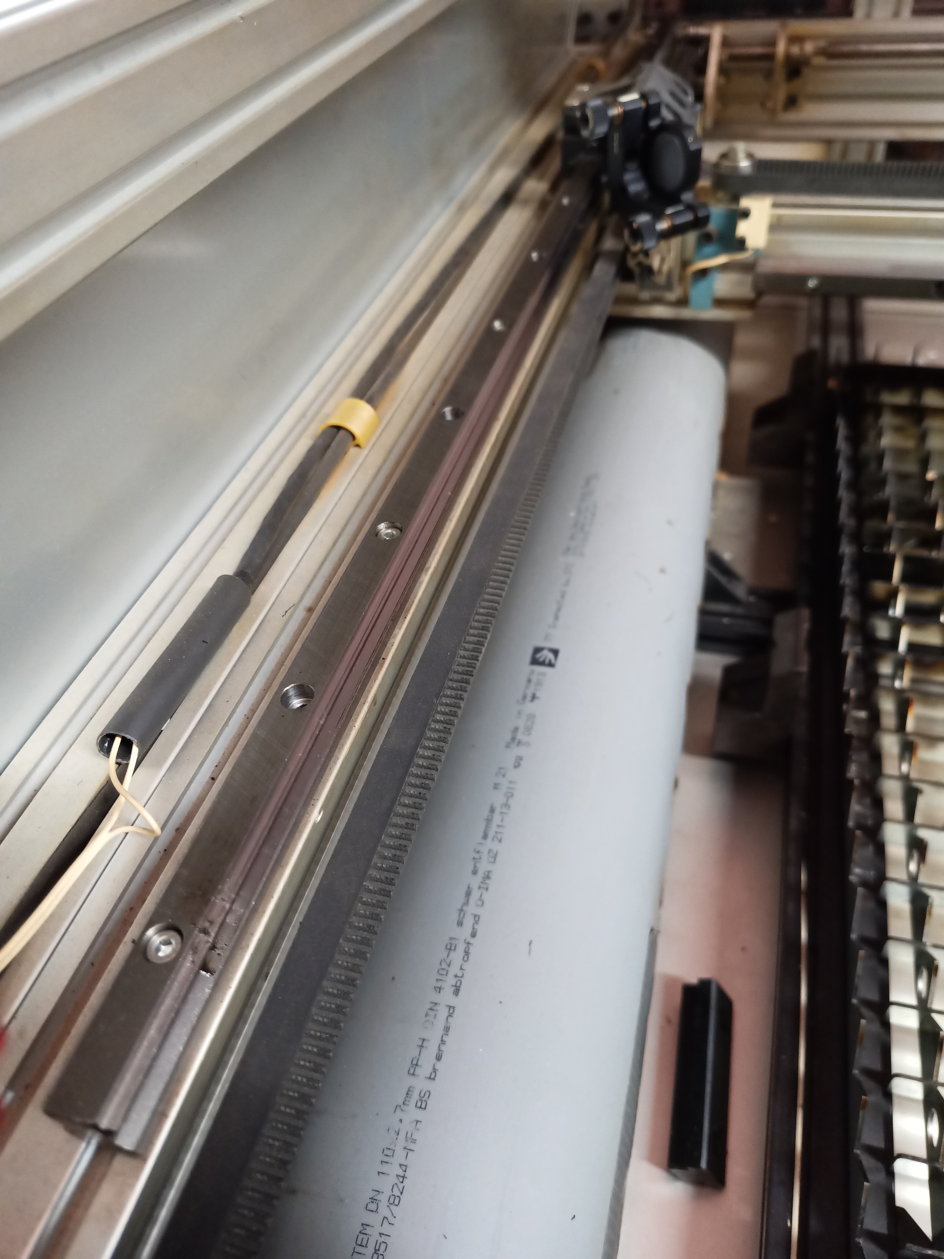 Wir haben uns bewusst für ein Set aus zwei 1500mm langen HSR15 Schienen mit je zwei Schlitten entschieden. Das war die günstigste Alternative die wir am besten für unseren Zweck anpassen konnten. Eine Schiene haben wir auf die nötige Länge der x-Achse zugesägt (die Länge sollte in etwa zu den montierten Endstops passen). Die zweite Schiene wurde zu zwei in etwa 650 mm langen Teilen gesägt um die Traverse in y-Richtung bewegen zu können.